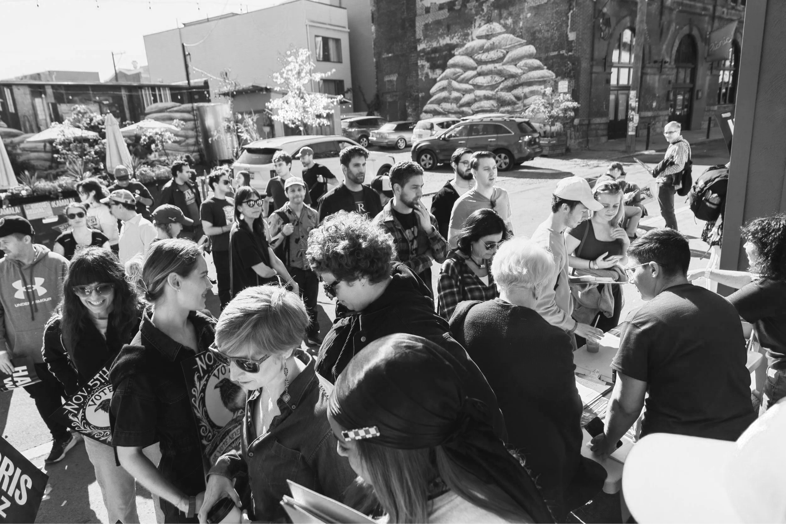 In 2024, Riverwards Votes! organized a diverse grassroots coalition of over 200 volunteers to mobilize our neighbors to vote. Together we knocked on nearly 18,000 doors throughout the final 8 weeks and contacted nearly 1,000 mail-in voters over GOTV Weekend to ensure every vote counted. And in addition to these conventional methods of outreach, we also commissioned local artists for a public art campaign and distributed hundreds of posters containing election information and deadlines to help inform voters.