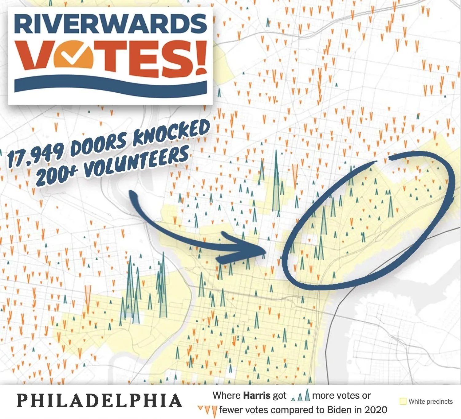 Despite strong national headwinds that saw 90% of U.S. counties shifting in favor of Trump, as well as decreased Democratic turnout throughout the city and across the country, we bucked the trend here in the Riverwards because of our tireless efforts.